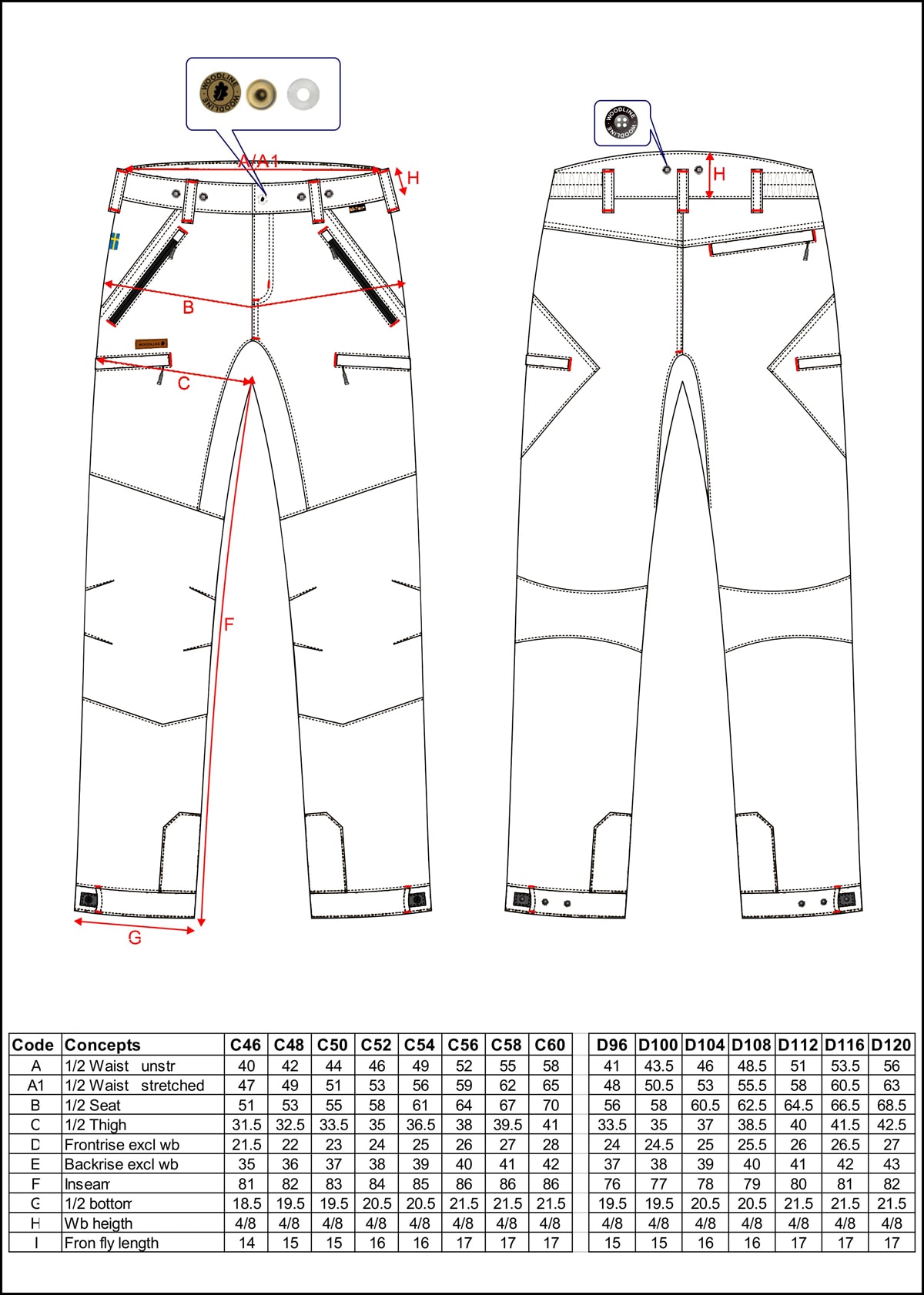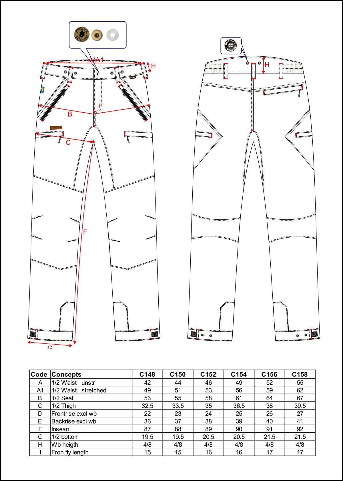Tuffa fritidsbyxor som är tunna, lätta och smidiga. Med tejpade sömmar vilket gör den vind- och vattentät. Upptill två snedställda fickor med dragkedja och en bakficka med lock och dragkedja. Två benfickor med lock och dragkedja.