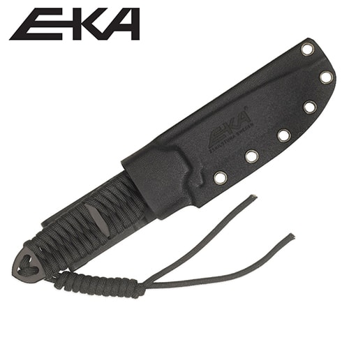 Överlevnadskniv med svärtat blad och paracordflätat skaft som går att knyta upp och använda i nödsituationer.