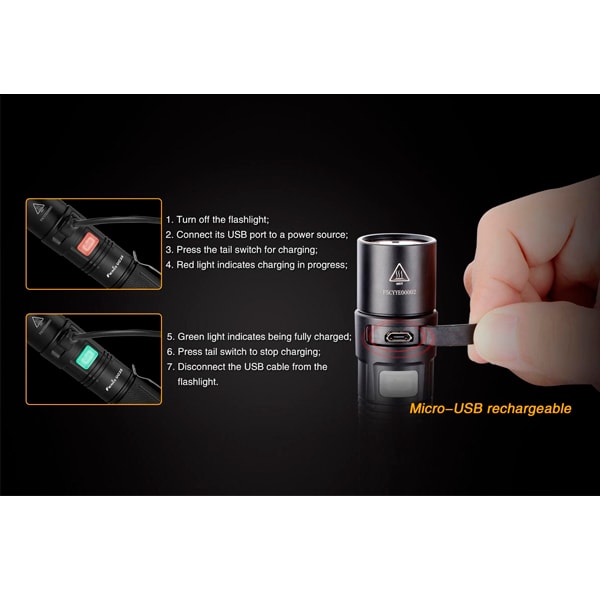 Laddbar via Micro USB 5V/2A, 18650 uppladdningsbart Li-Ion batteri ingår.