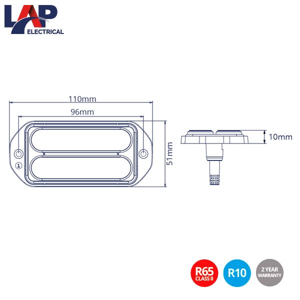 • Uppfyller ECE R10, enkelblink uppfyller ECE R65, klass II