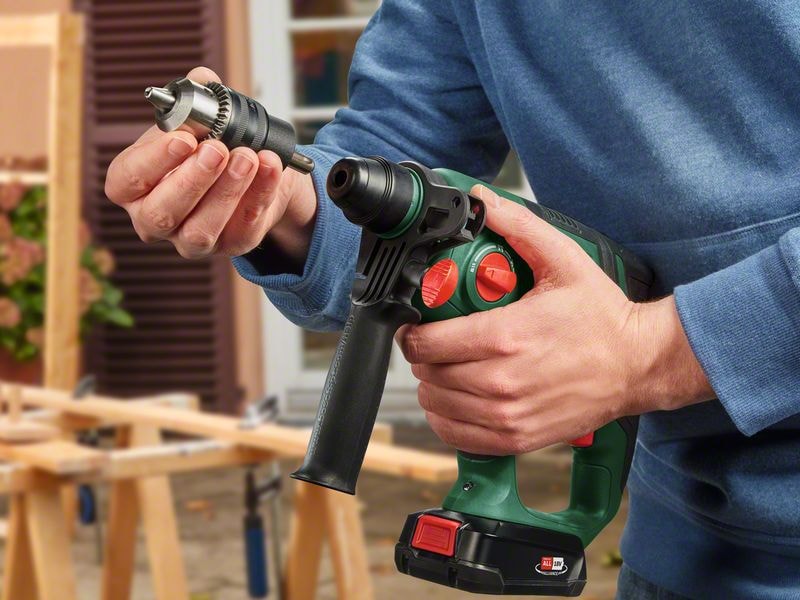 - Universell SDS plus-borrchuck för enkelt, verktygslöst byte av borrbits och mejslar