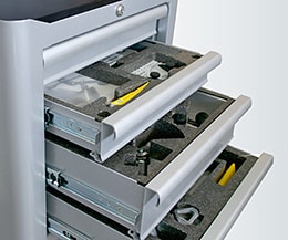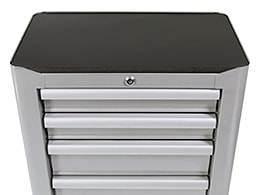 Mjukstängande lådor med kullagring. Ett centrallås säkrar alla lådor.