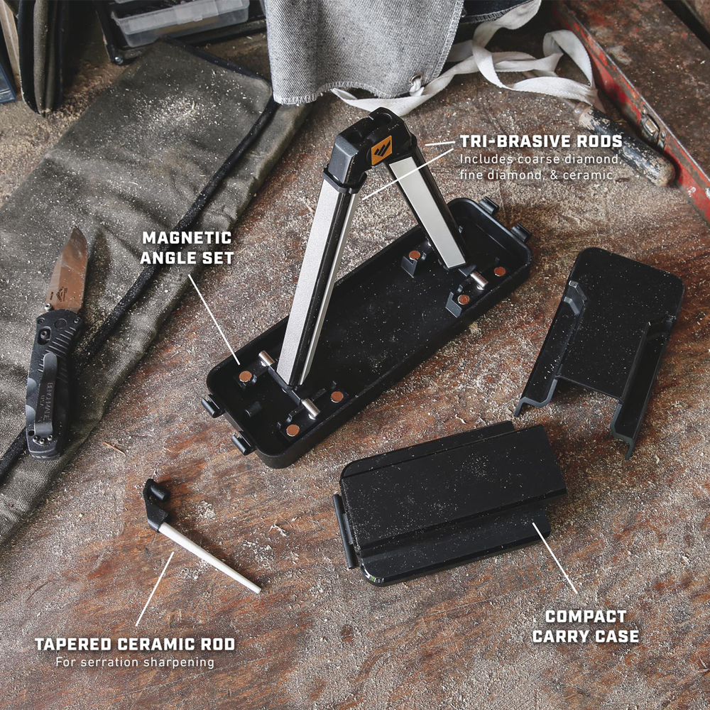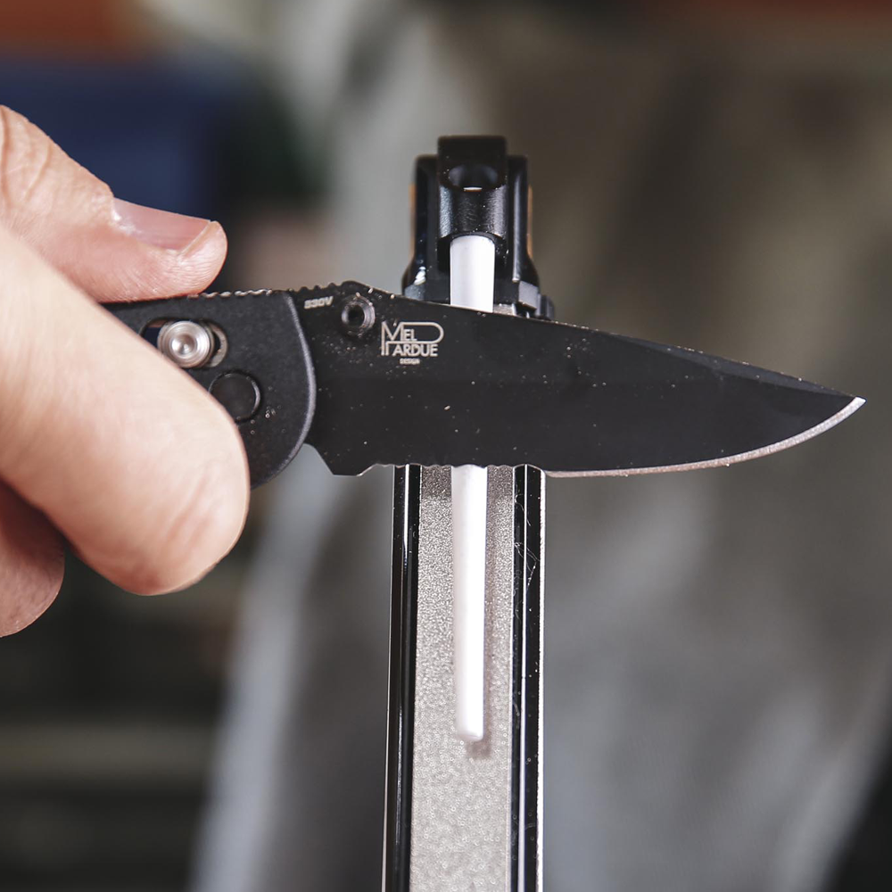 Komplett och smidig lösning för dig som vill slipa dina knivar, saxar, rakblad eller yxor hemma. Fäll enkelt upp slipstålet och justera till den slipsida som du önskar använda.
