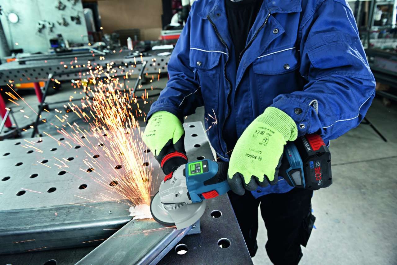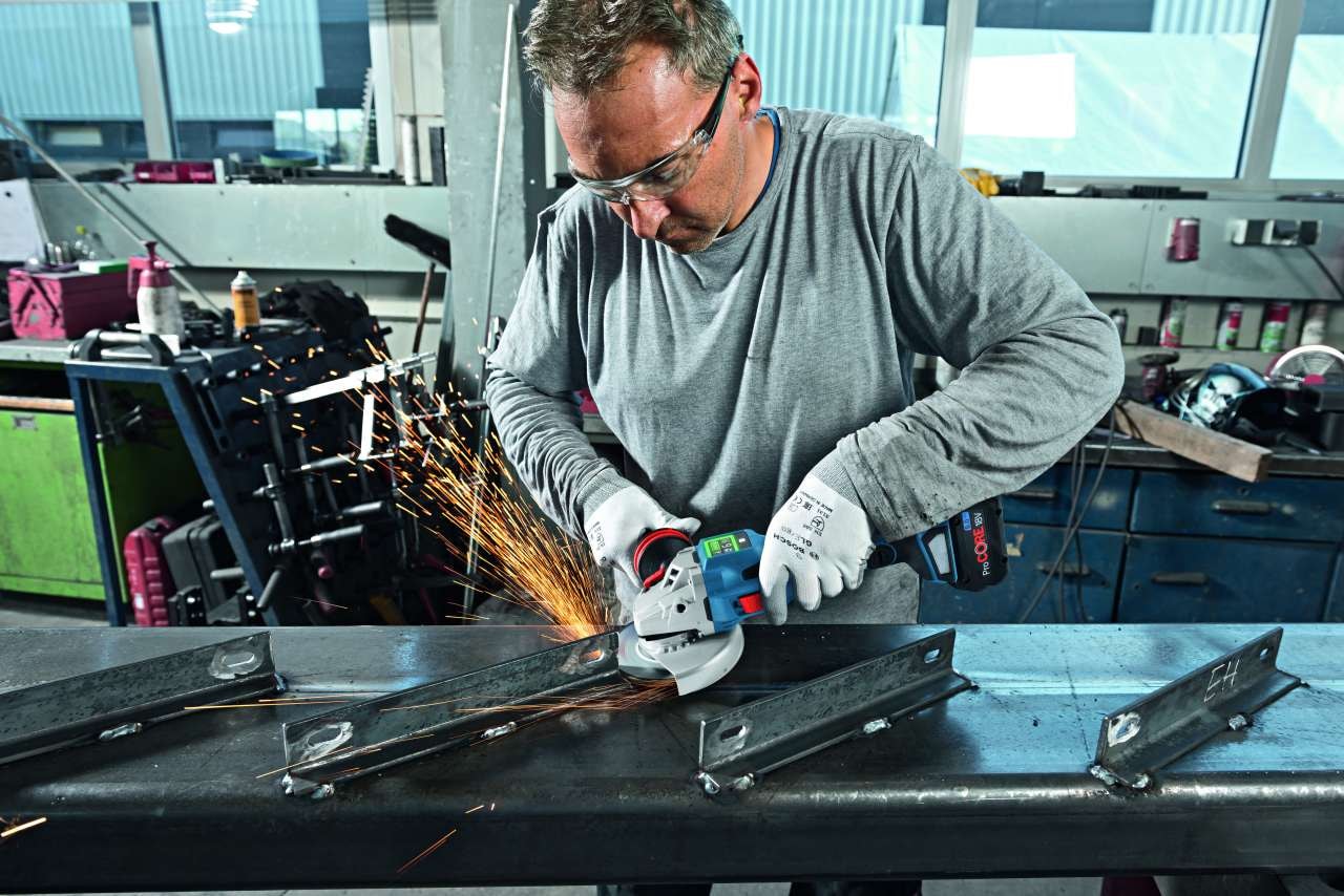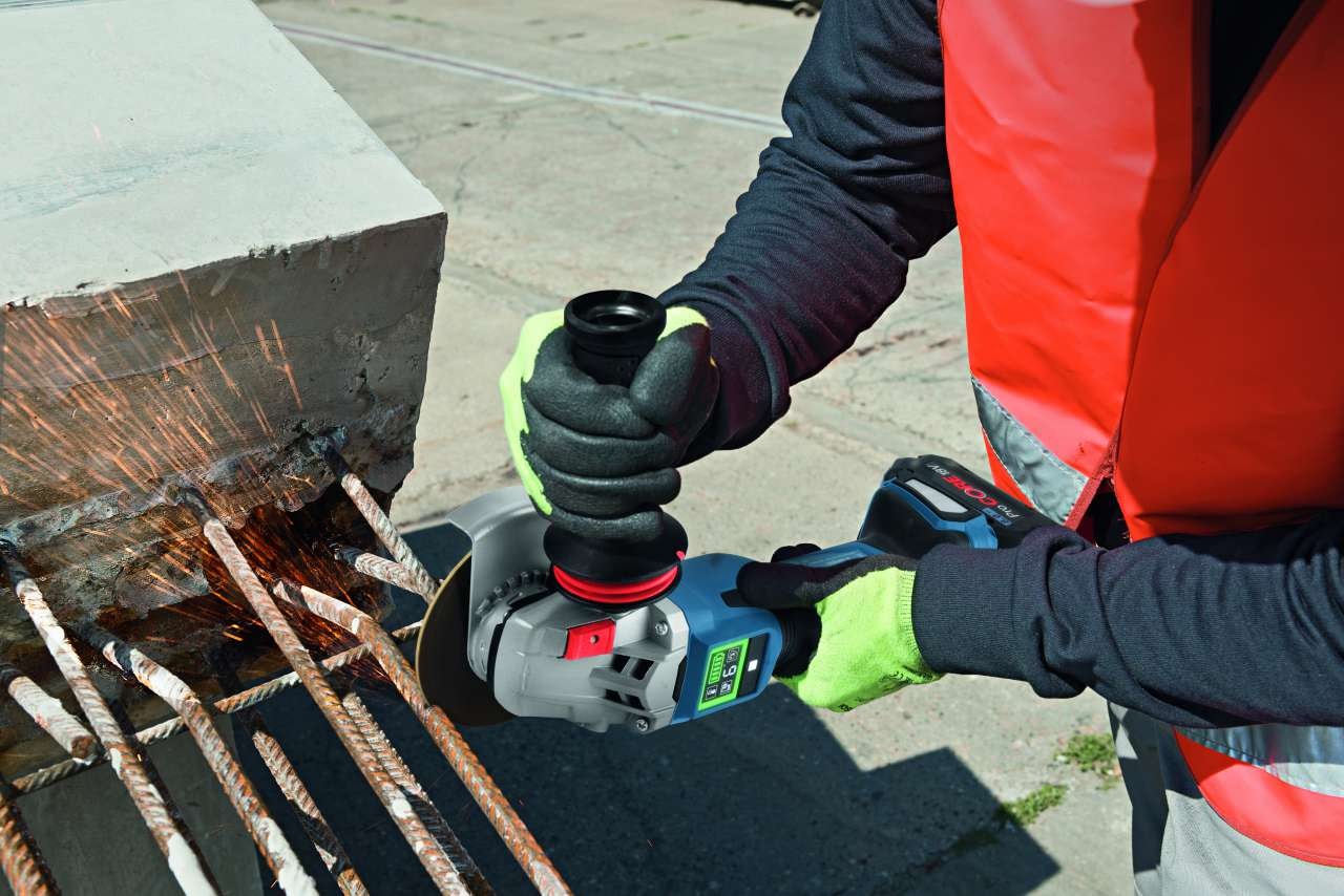 Den är lämplig för slipning och kapning av metall. Den är kompatibel med alla 18 V-batterier och laddare från Bosch Professional (Professional 18V System) maximal effekt med ProCORE18V = 8,0 Ah liksom med dammtillbehören GDE 115/125 FC-T Professional och GDE 125 EA-T Professional.