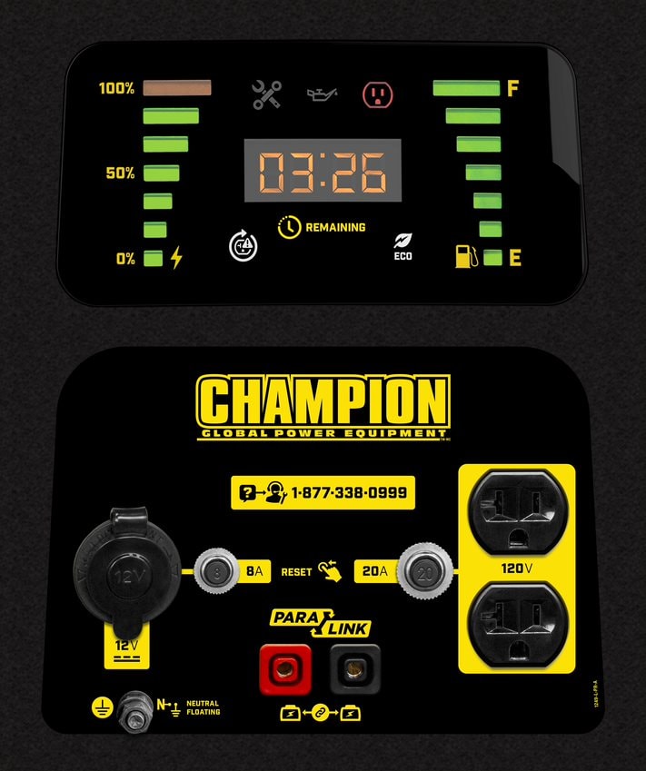 Champions pålitliga 80cc motor producerar 2000W i starteffekt och 1600W kontinuerligt och kan köras upp till 11 timmar när 4.1 liters tanken är fylld. Elverket har två AC-uttag, ett 12V DC-uttag och en USB-adapter med två portar.