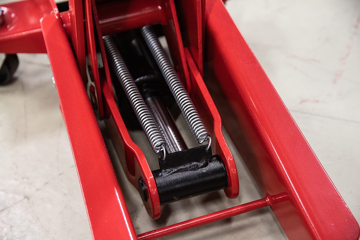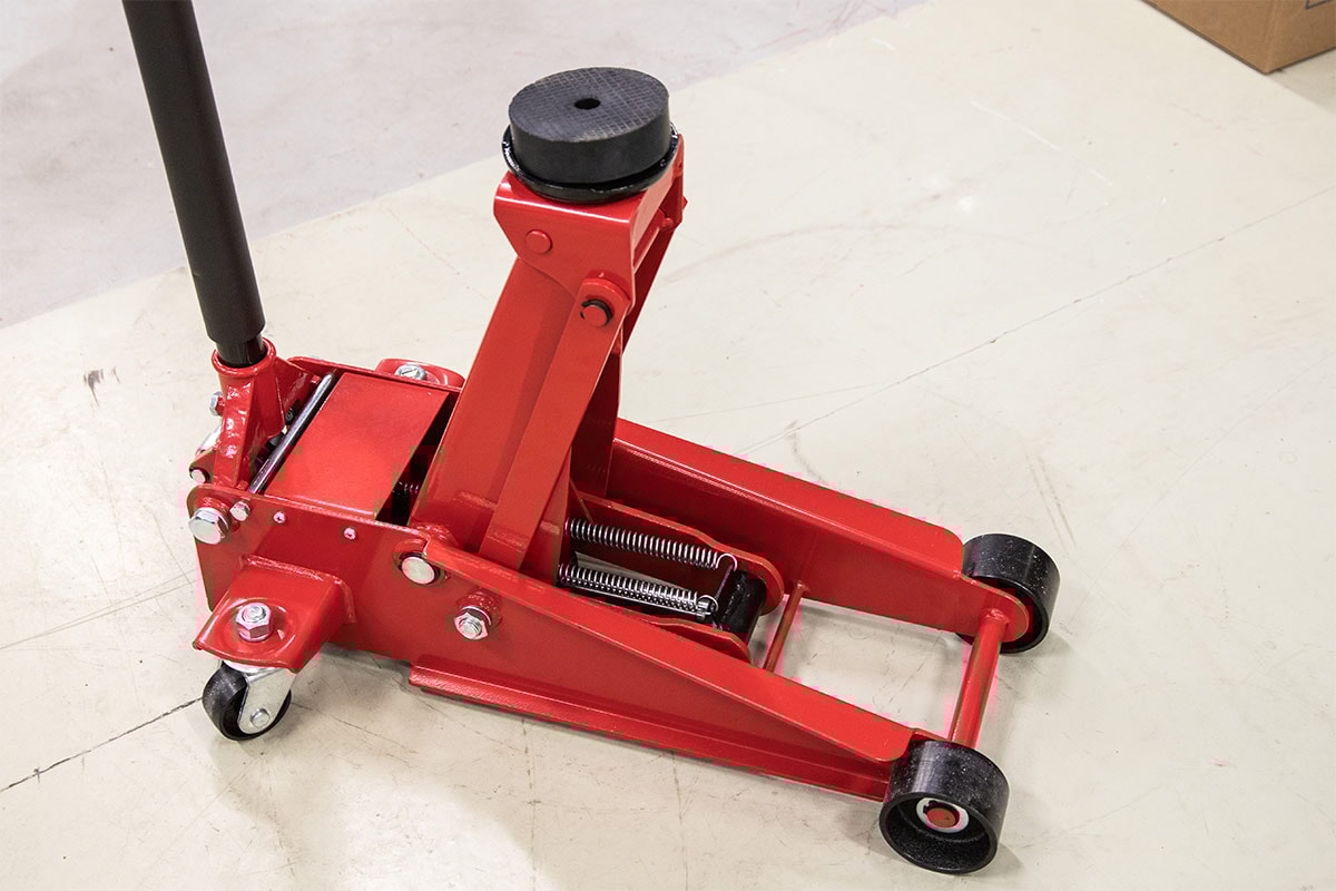 Garagedomkraft konstruerad för att uppnå maximal styrka och stabilitet. Avtagbart handtag. Domkraften levereras med svängbara hjul och vridbar lyftsadel.