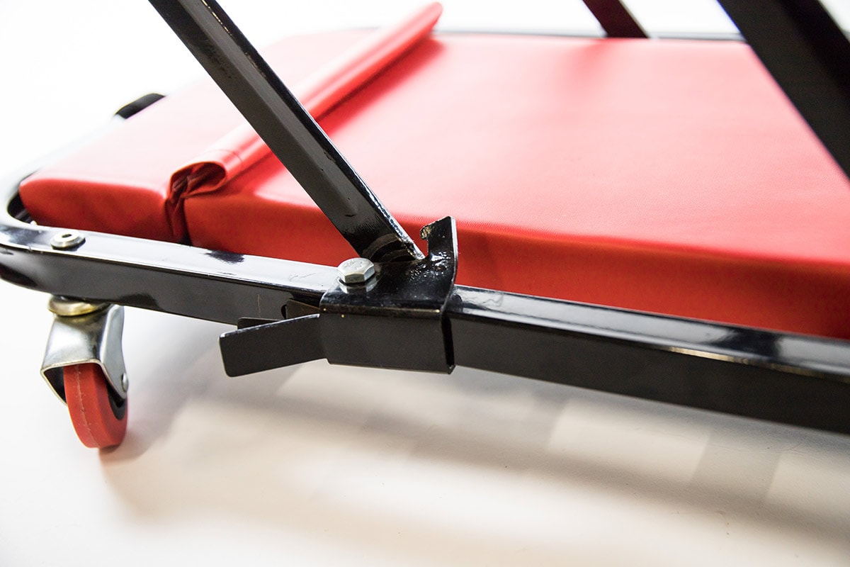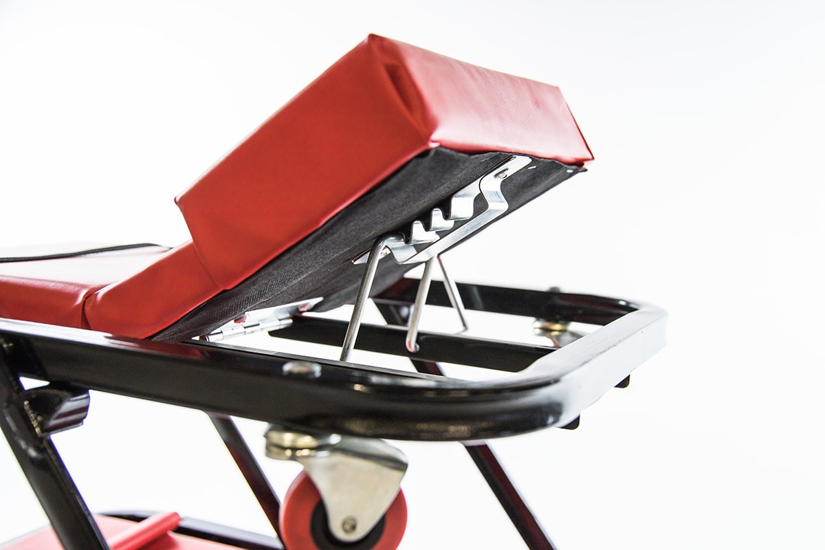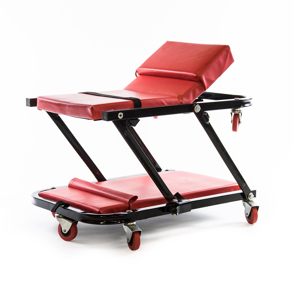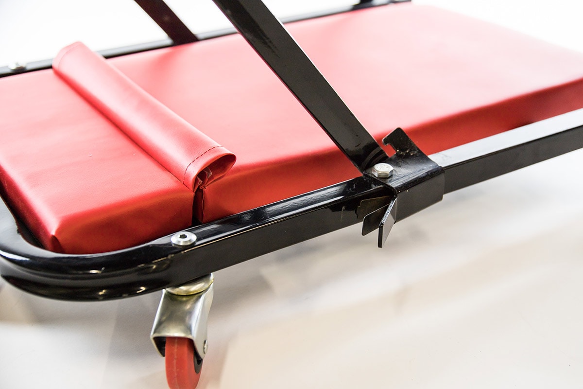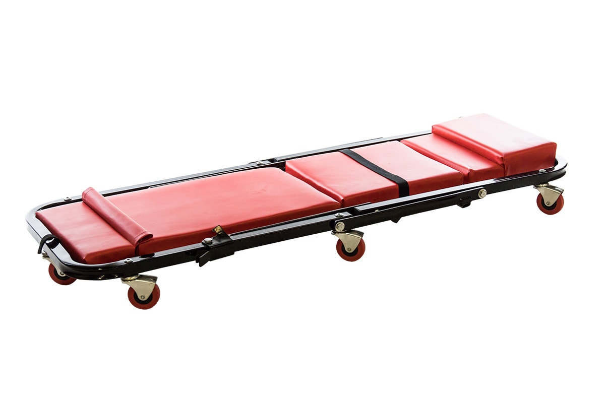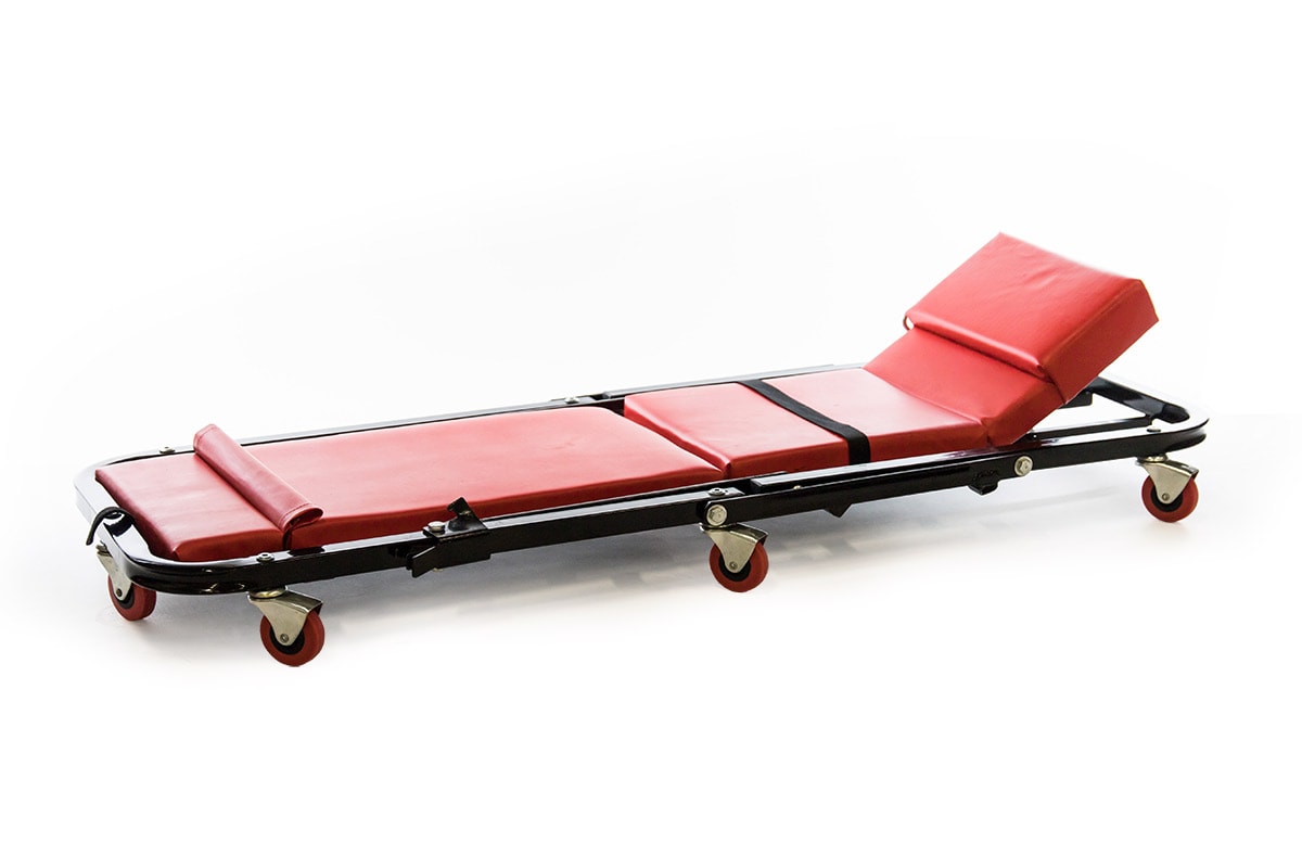 Montörvagn med mjuk stoppning med nackkudde. Perfekt för bilverkstäder, garage mm.