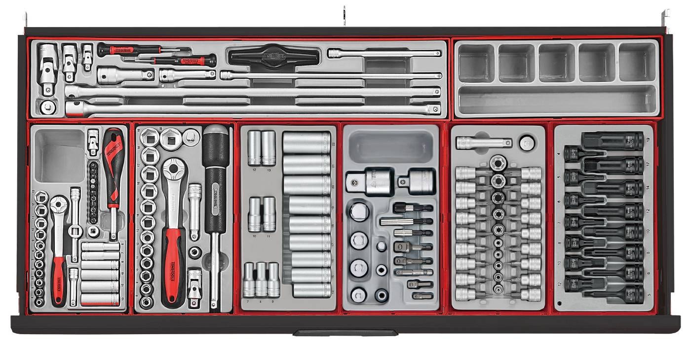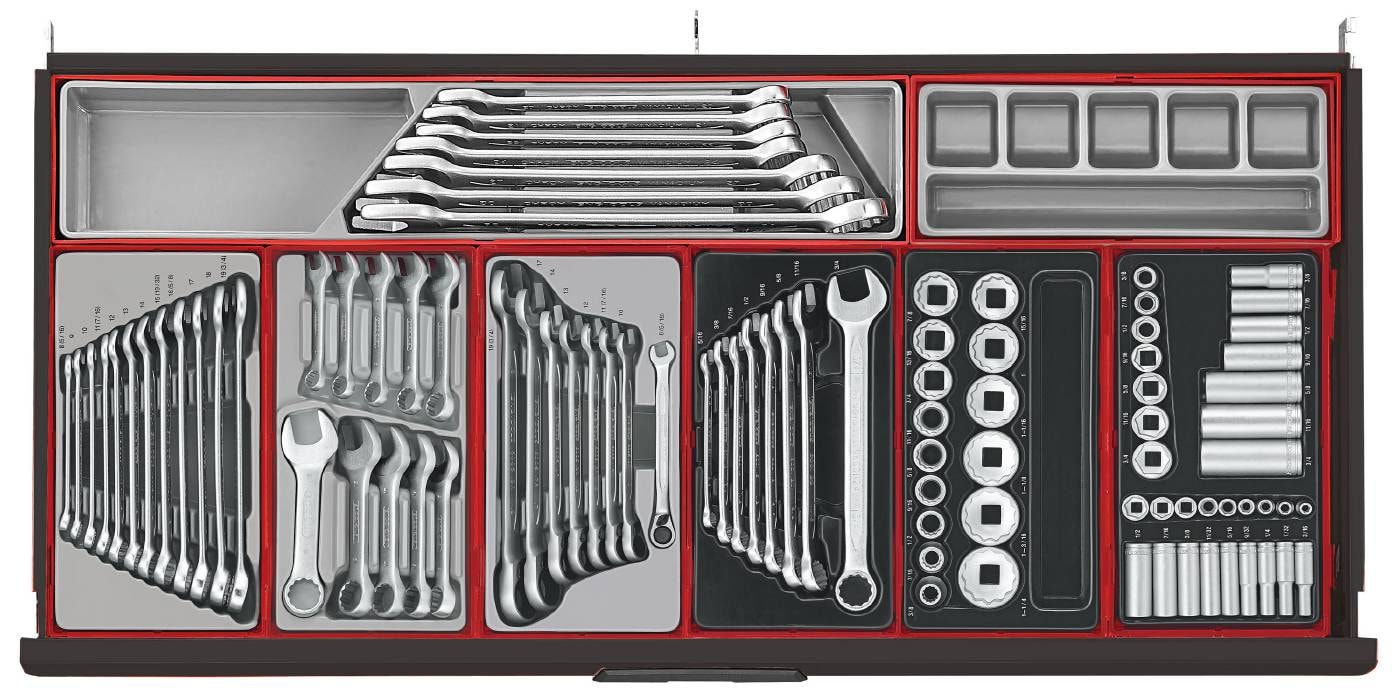 - Alla verktyg är placerade i individuella verktygssatser uppbyggda med Teng Tools Get Organised-system. Det är lätt att se om något verktyg inte ligger på sin plats, så att inget glöms kvar på arbetsplatsen. Levereras i Teng Tools extra bred (950 mm) verktygsvagn TCW208NBK1 med åtta lådor i svart högglanslack.