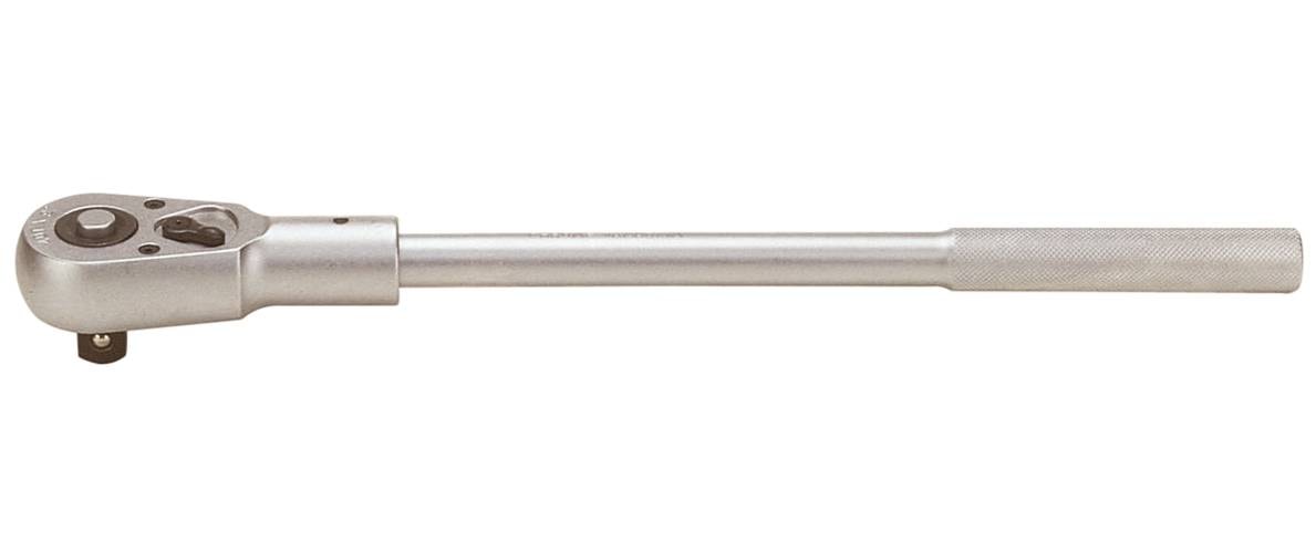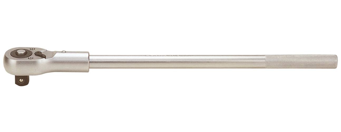 Av kromvanadinstål. Kraftigt spärrhandtag med löstagbart spärrhuvud. Omställbar med spak för såväl höger som vänstergång. Lettrat handtag. Mattförkromad.