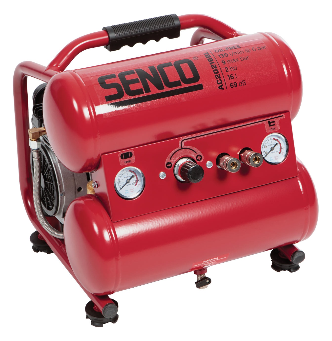 AC20216BL är en kompakt kompressor med 16 liters tank och en kraftfull 2HP motor.
