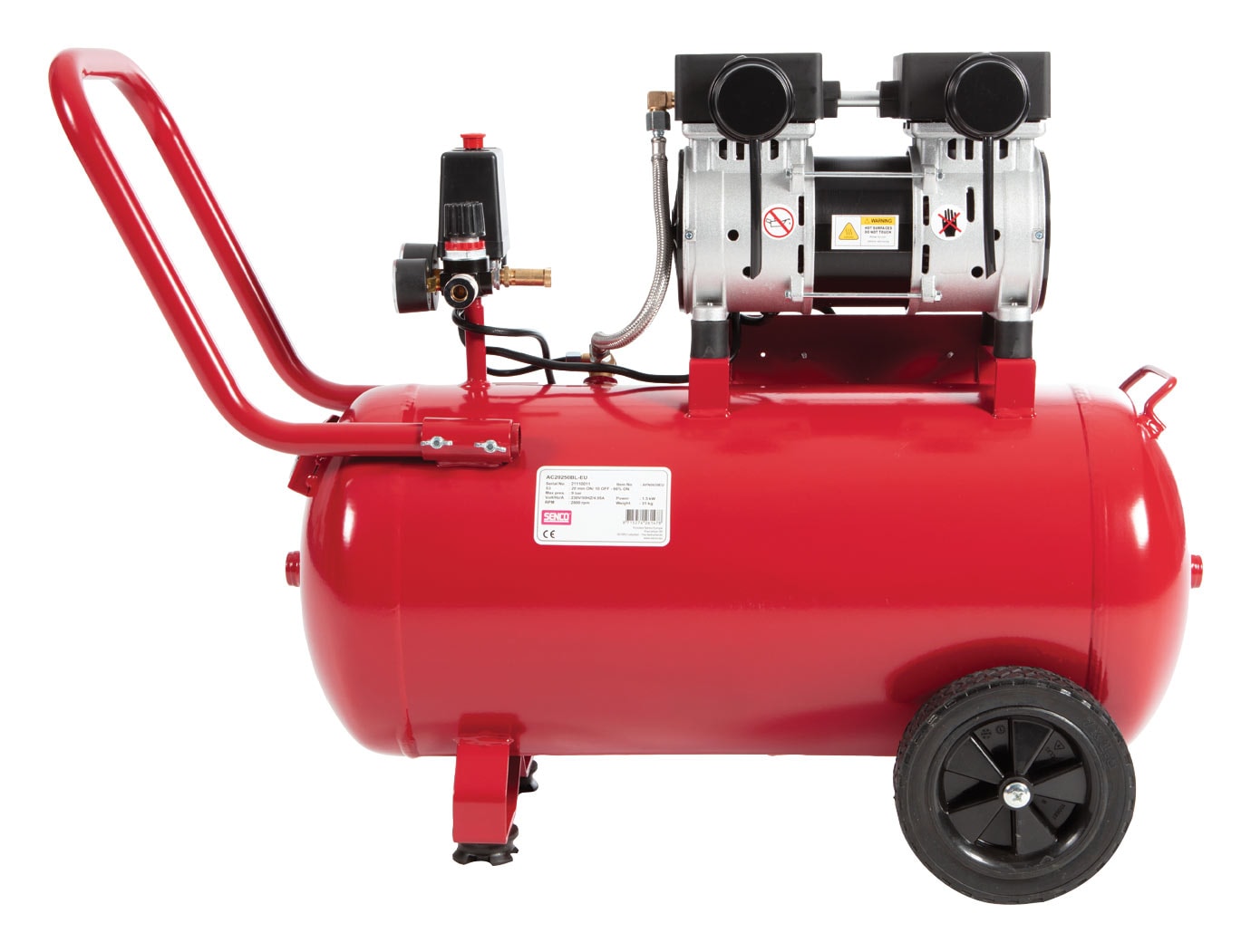 De solida gummihjulen och det bekväma handtaget gör kompressorn enkel att transportera mellan olika platser.