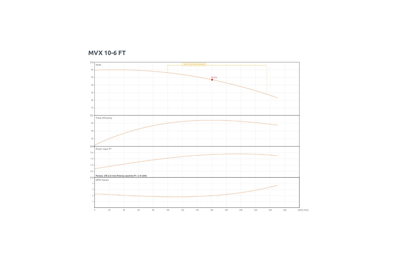 Centrifugalpumparna i MVX-serien tillverkas från 1,5 kW (2 hk) upp till 15 kW (20 hk) med tryckhöjder (H m) från 30 till 270 meter samt flöden (Q) från 45 till 500 l/min.