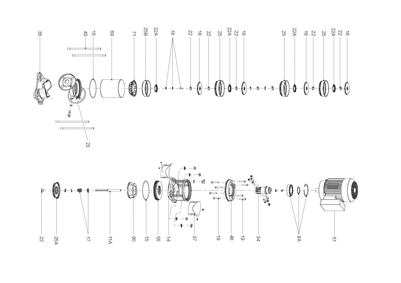 Samtliga pumpdelar är tillverkade i rostfritt stål AISI 304. Pumpen är försedd med sug- och tryckstos i linjärt utförande. Motorfäste tillverkat i rostskyddsbehandlat gjutjärn samt försedd med en driftsäker elektrisk motor (kapslingsklass IPX4 och isolationsklass F).