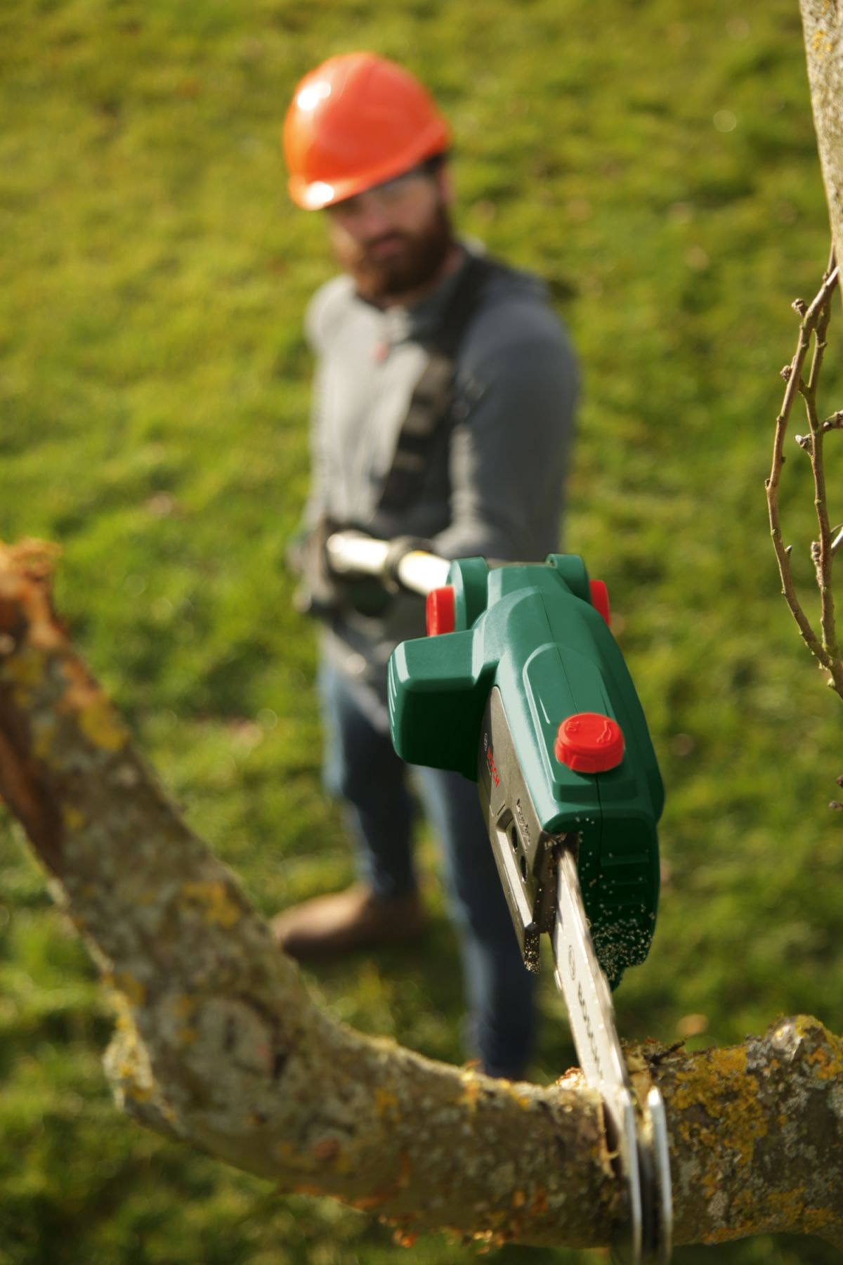 Beskär trädgrenar från marknivå, utan stege och med lätthet. UniversalChainPole 18 ger dig enkel beskäring i svåråtkomliga områden med hjälp av teleskopstången och det vridbara huvudet. Välbalanserad, lätt och ergonomisk design minimerar ansträngningen för armar och axlar, samtidigt som toppskyddet och stötspetsen ger dig maximal kontroll vid beskäring och klippning underifrån. Den automatiska kedjesmörjningen och en oljenivåindikator säkerställer att verktygets drift är smidig och ger konsekventa resultat. Använd den sladdlösa UniversalChainPole 18 för kontinuerlig beskäring utan att skada trädet. Verktyget ingår i POWER FOR ALL ALLIANCE. Ett batteri kan användas i en stor mängd verktyg från olika märken.