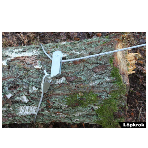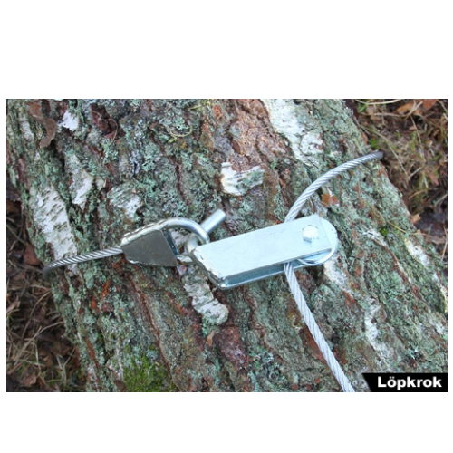 Löpkroken består av fyra delar: Ögla, Kil, Krok och Linhjul. Två kilar ingår, en för 6 mm vajer och en för 8 mm vajer.